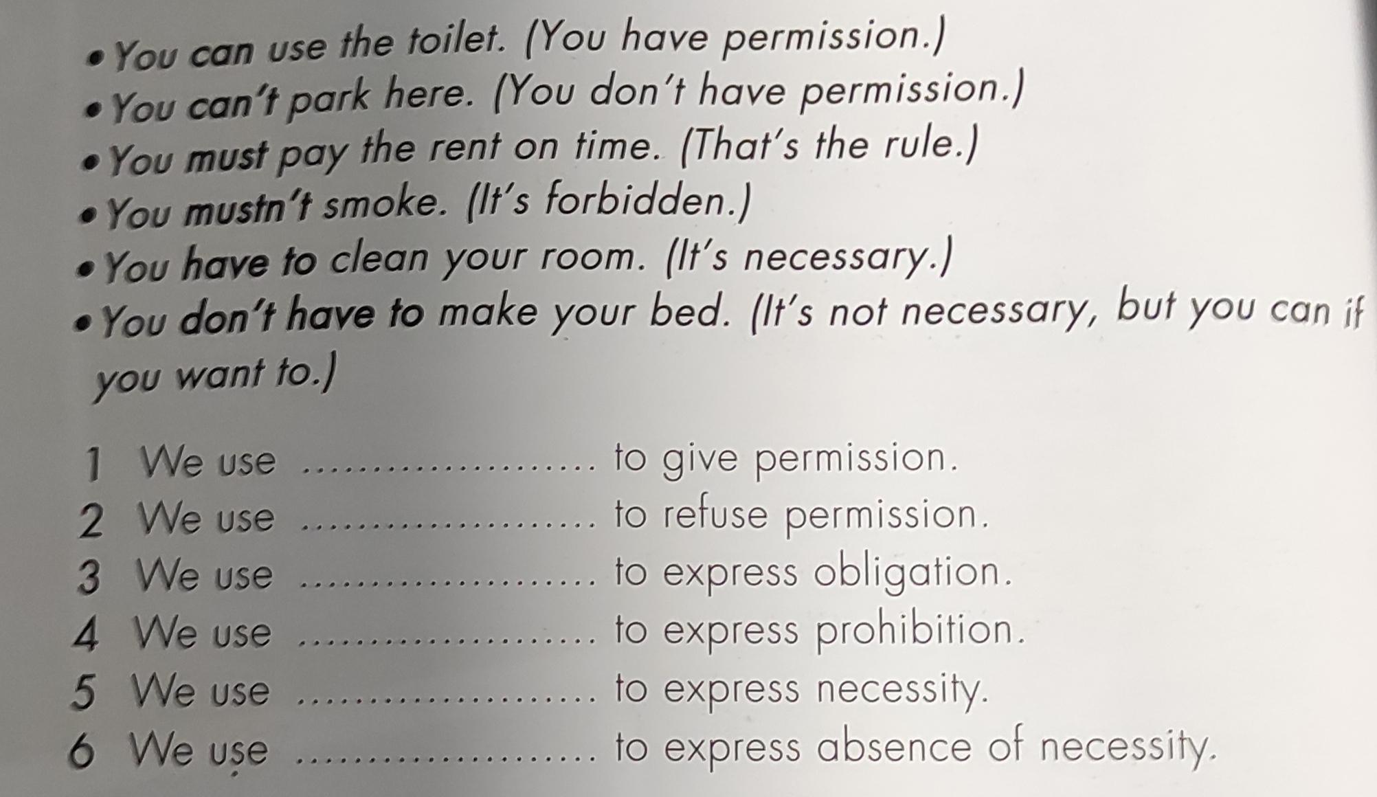 1. can 2. cant 3. must 4. mustnt 5. have to 6. dont have to