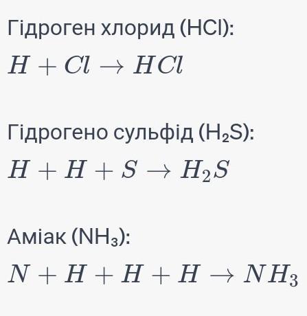 Зобразіть процес утворення молекул гідроген хлориду HCl, гідрогено сульфіду H₂S, fмоніаку NH₃ з атомів