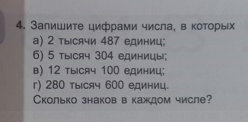 4. Запишите цифрами числа, в которых а) 2 тысячи 487 единиц; б) 5 тысяч 304 единицы; в) 12 тысяч 100 единиц; г) 280 тысяч 600 единиц. Сколько знаков в каждом числе?