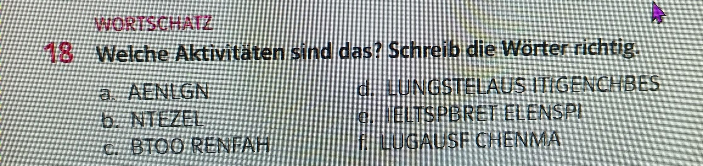 18 Welche Aktivitäten sind das? Schreib die Wörter richtig. d. LUNGSTELAUS ITIGENCHBES e. IELTSPBRET ELENSPI f. LUGAUSF CHENMA a. AENLGN b. NTEZEL c. BTOO RENFAH