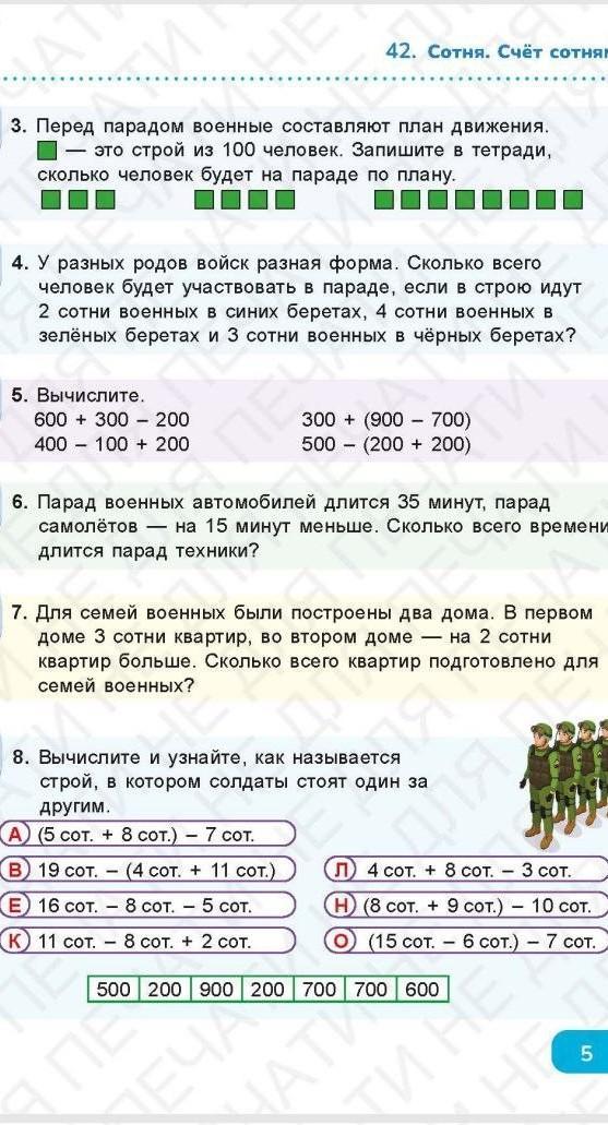 3. Перед парадом военные составля план движения строй из 100 в тетради, сколько человек будет на породе по плану.
