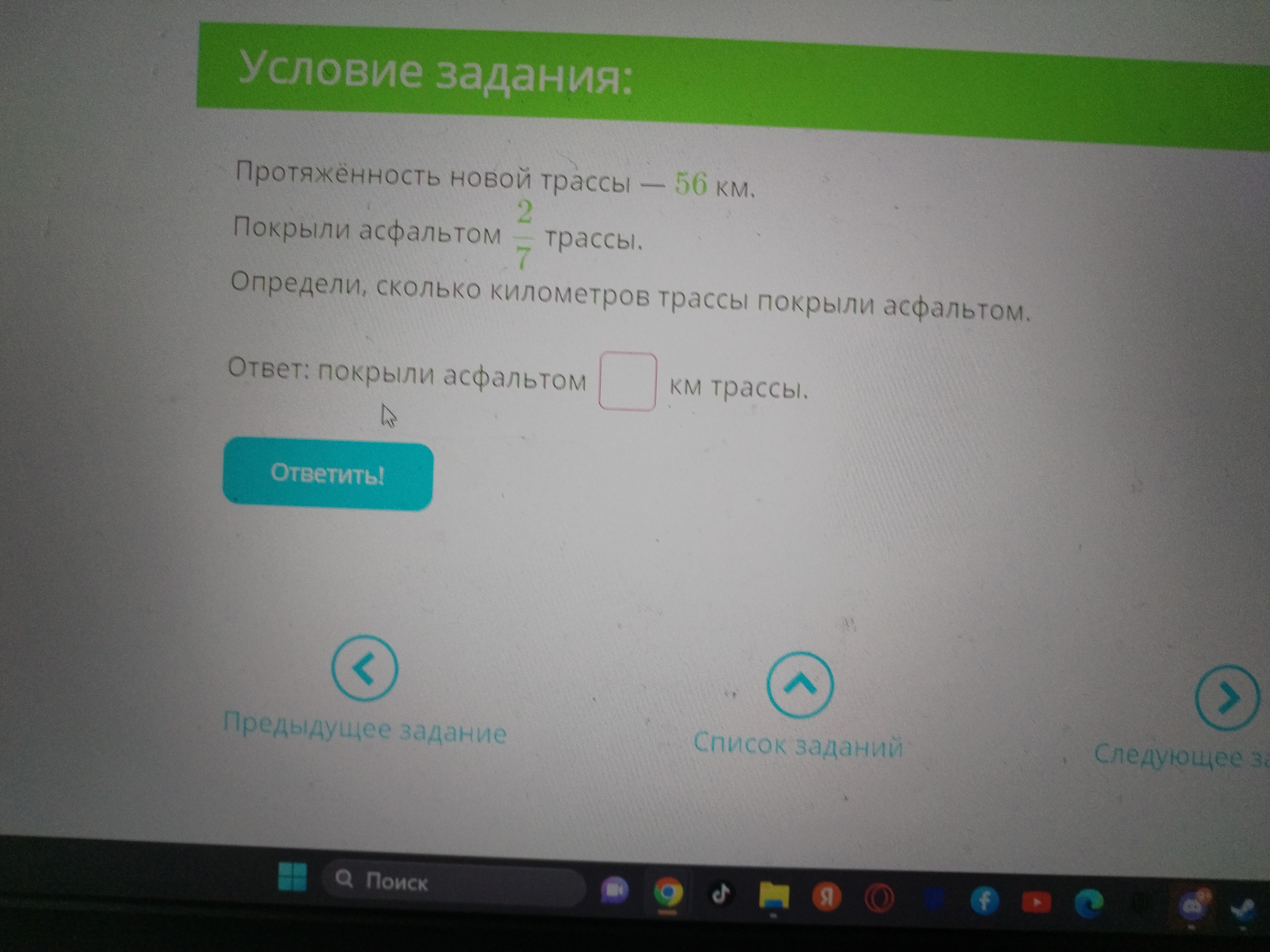 2/7 * 56 = 2/1 * 8 = 16/1 = 16 (м) - покрыли асфальтом