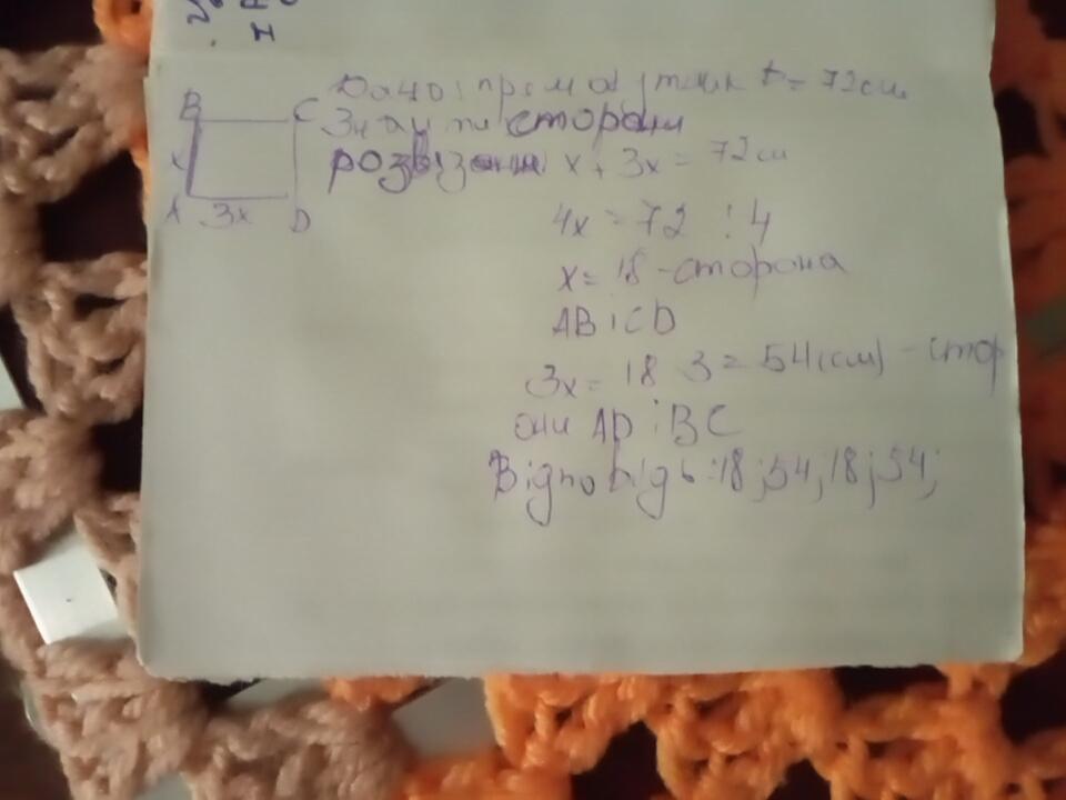 Одна сторона прямокутника в три рази більша за другу. Периметр=72мм. Знайти сторони прямокутника.