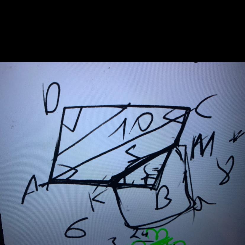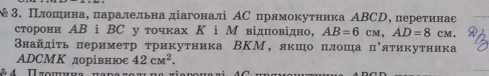 Площина, паралельна діагоналі АС прямокутника ABCD, перетинає сторони АВ і ВС у точках К і М відповідно, AB=6 см, AD=8 см. Знайдіть периметр трикутника ВКМ, якщо площа п'ятикутника ADCMK дорівнює 42 см².