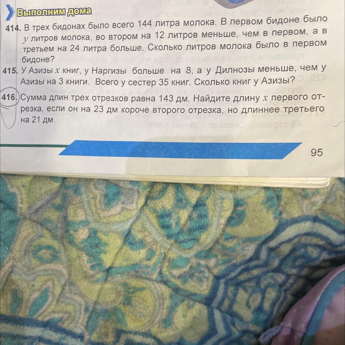 414. В трех бидонах было всего 144 литра молока. В первом бидоне было у литров молока, во втором на 12 литров меньше, чем в первом, а в третьем на 24 литра больше. Сколько литров молока было в первом бидоне?