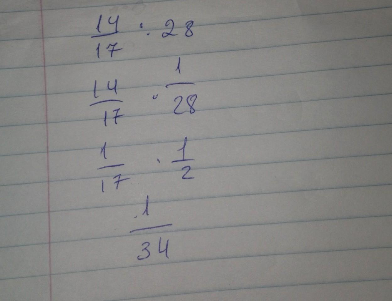14/17 ÷ 28 = 14\17 ÷ 28/1 = 14\17 × 1/28 = 1/17 × 1/2 = 1/34