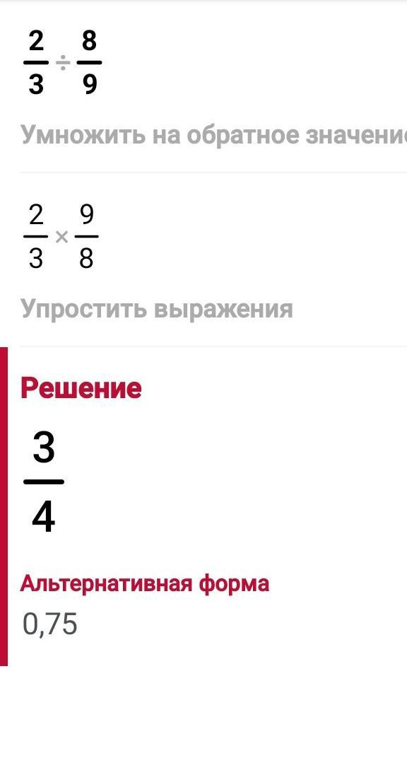 2/3 : 8/9 =2/3 *9/8 =1 * 3/4 =3/4