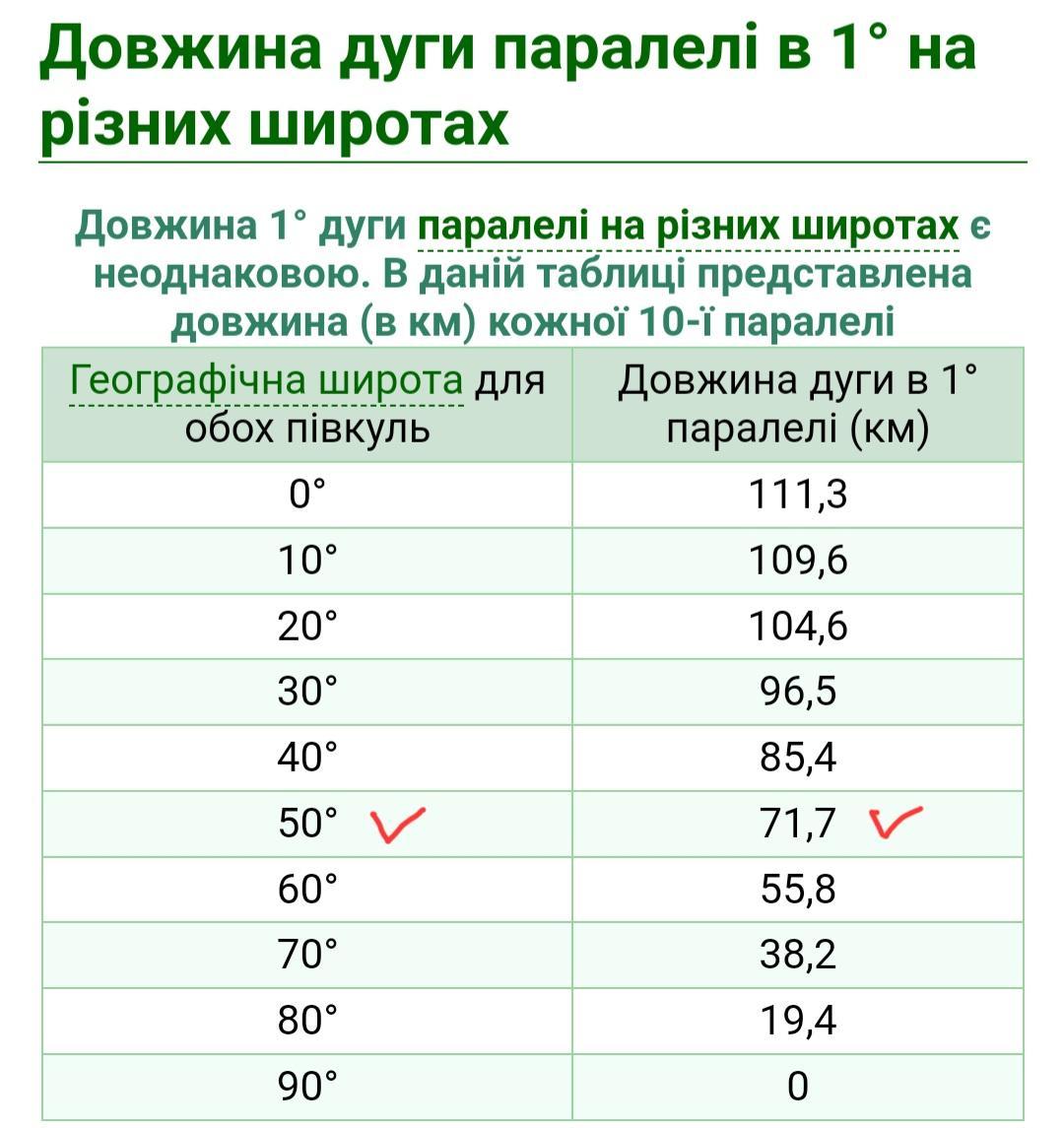 Щоб знайти відстань по паралелі 50°, знаходимо спочатку відстань в градусах між точками, потім по таблиці знаходимо чому дорівнює 1° по даній паралелі і множимо довжину 1° (71,7 км) на кількість градусів.
