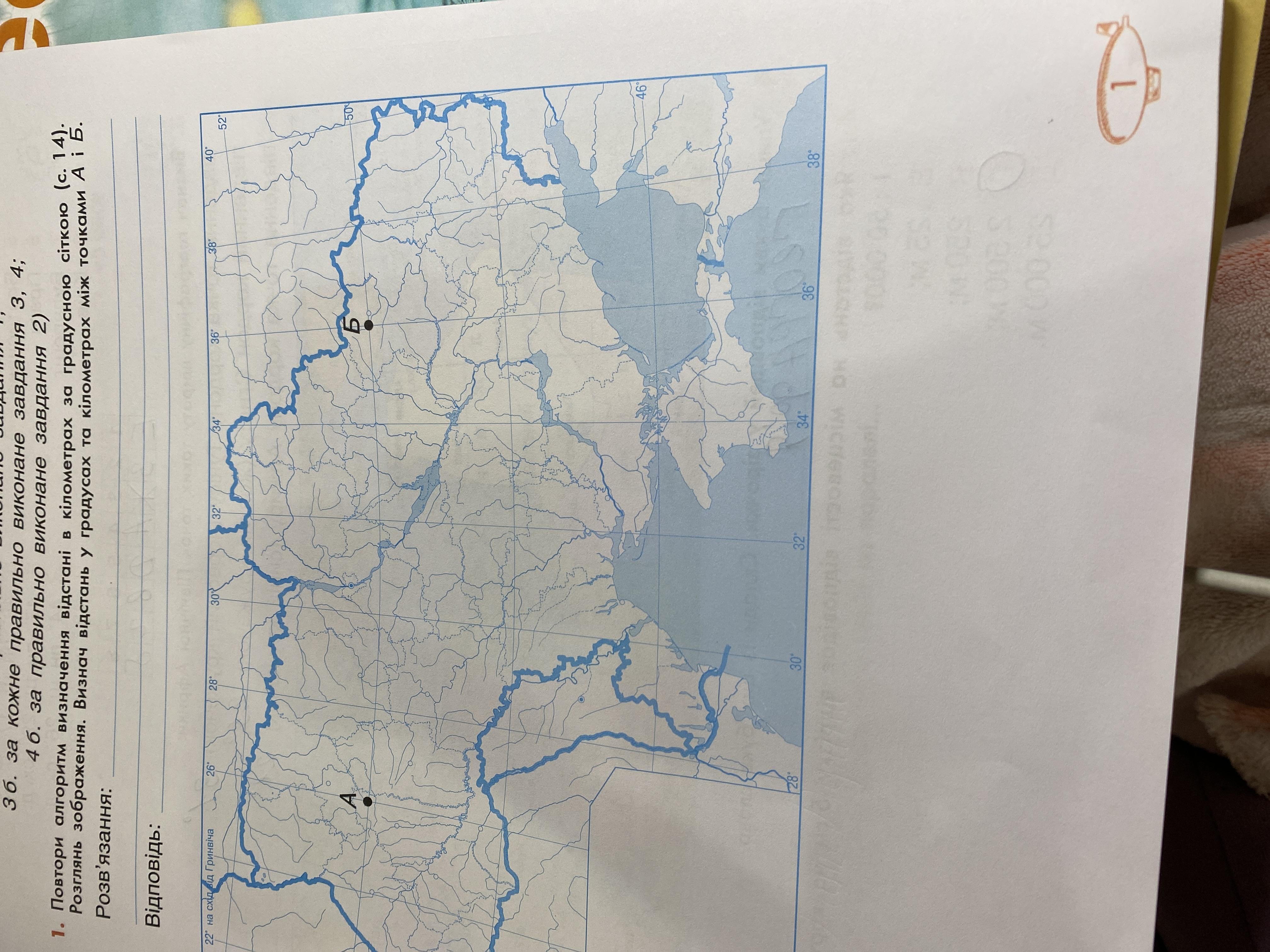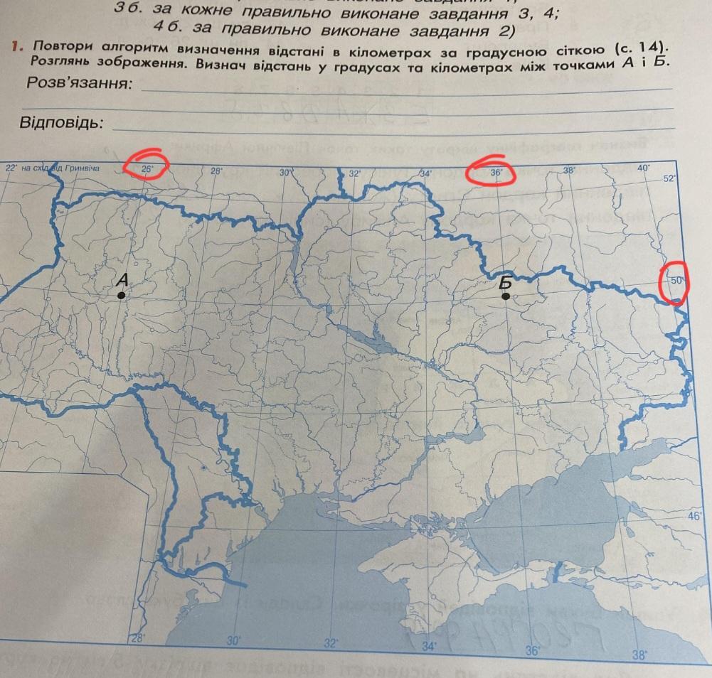Далі, знайдену відстань між точками у градусах множимо на показник 1° дуги паралелі 50°: