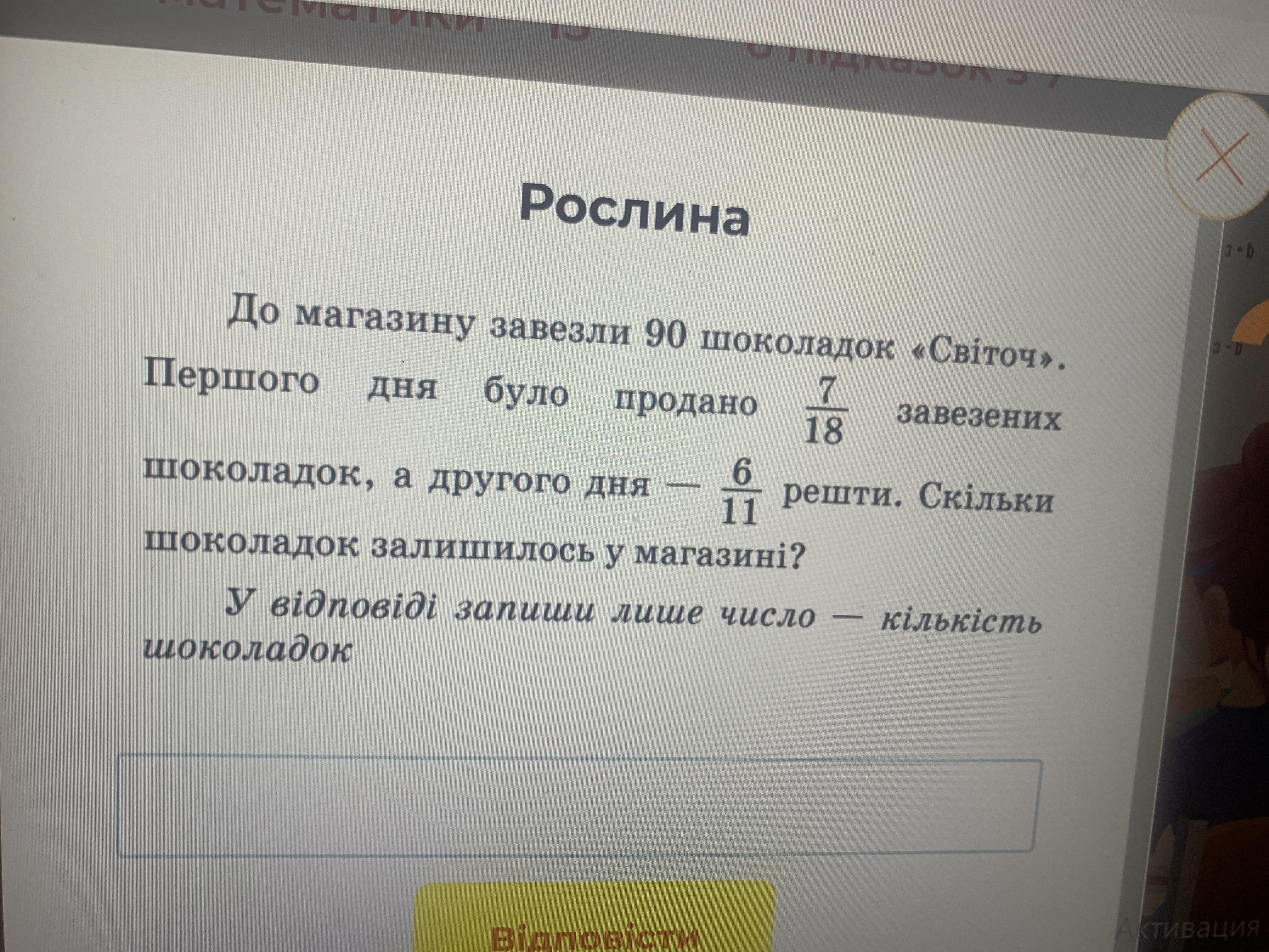 1 день продано 90*7/18=35; Решта 90-35=55; 2 день продано 55*6/11=30; Залишилось 55-30=15;