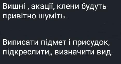 Вишні, акації, клени (підмети) будуть привітно шуміть (присудок).
