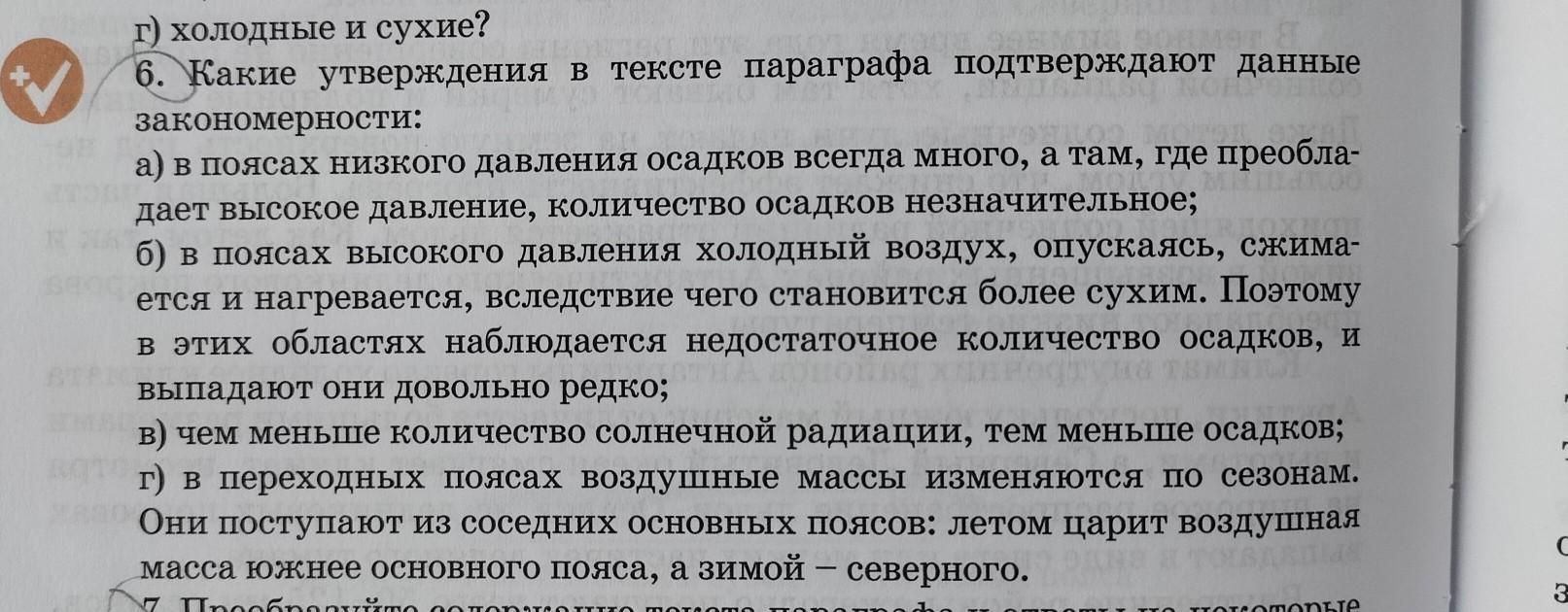100 баллов! 6. Какие утверждения в тексте параграфа подтверждают данные закономерности: a) в поясах низкого давления осадков всегда много, а там, где преобла- мато дает высокое давление, количество осадков незначительное; б) в поясах высокого давления холодный воздух, опускаясь, сжима- ется и нагревается, вследствие чего становится более сухим. Поэтому в этих областях наблюдается недостаточное количество осадков, и выпадают они довольно редко; GRE ТВНЫ в) чем меньше количество солнечной радиации, тем меньше осадков; г) в переходных поясах