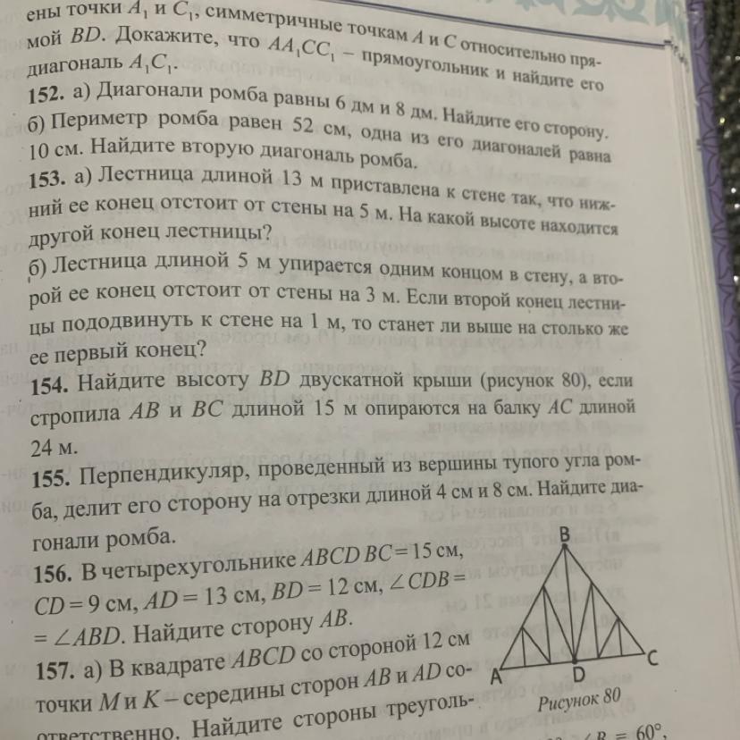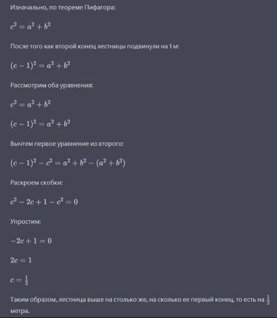 б) Лестница длинной 5 м упирается одним концом в стену, а второй ее конец отстоит от стены на 3 м. Если второй конец лестницы подвинуть к стене на 1 м, то станет ли выше на столько же ее первый конец?