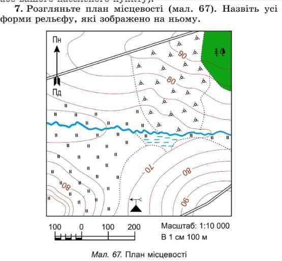 Розгляньте план місцевості (мал. 67). Назвіть усі форми рельєфу, які зображено на ньому.
