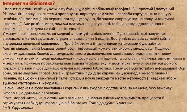 написати переказ, додаючи останній абзац про ваші думки, що краще - інтернет чи бібліотека