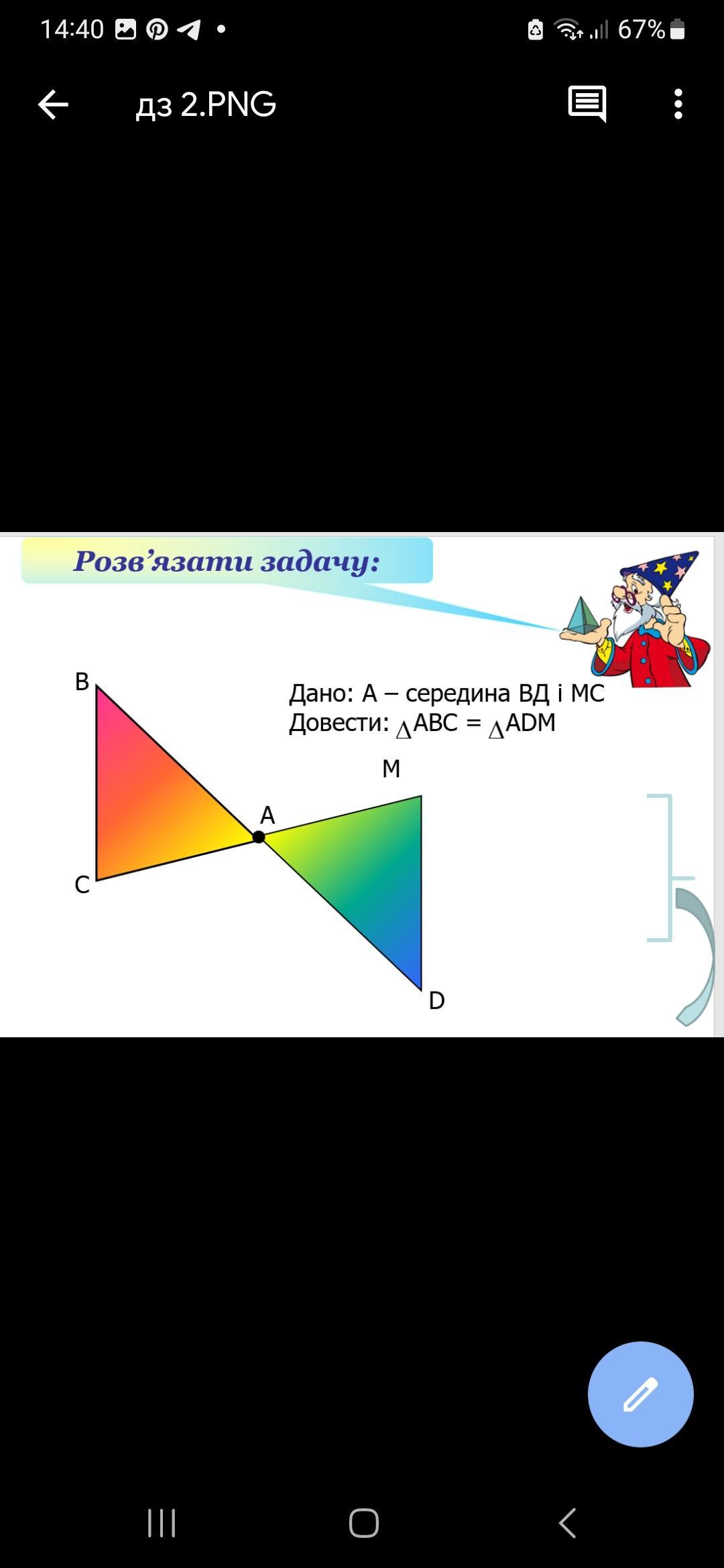 Друге фото: За 1 ознакою рівності трикутників (за 2 сторонами і кутом між ними: BA=AD, CA=AM, кут BAC = кут MAD як вертикальні);