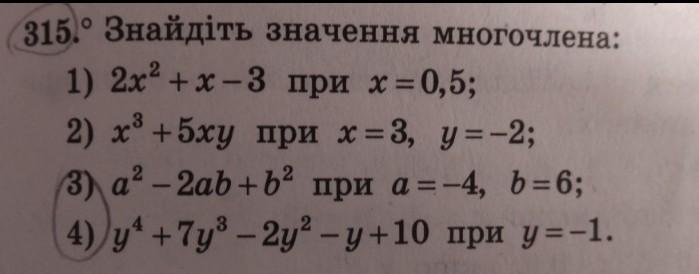 4) Можемо просто підставити ігрик на його місця. -1 у парному степені буде 1, -1 у непарному степені залишиться -1. Отже, (-1)^4+7·(-1)³-2·(-1)²-(-1)+10=1+7·(-1)-2·1+1+10=1-7-2+1+10=3