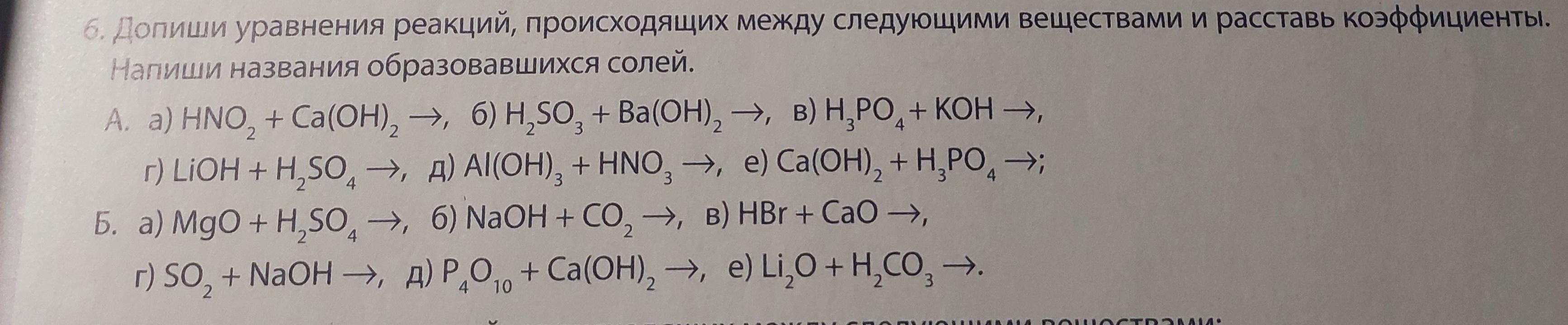 e) 3Ca(OH)2+ 2H3PO4= 6H2O+ Ca3(PO4)2-фосфат кальция