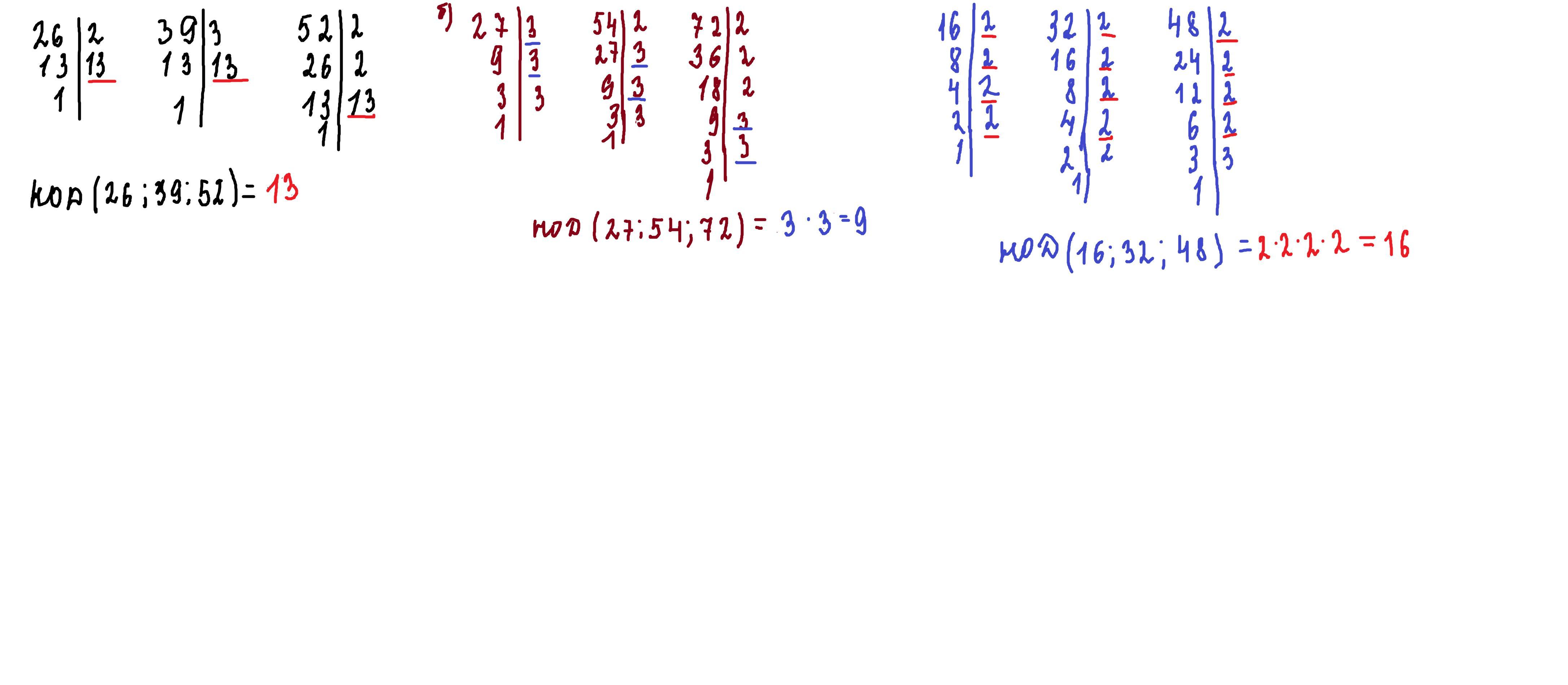 -. Знайди найбільший спільний дільник трьох чисел: a) 26, 39 i 52; 6) 27, 54 i 72; B) 16, 32 i 48.