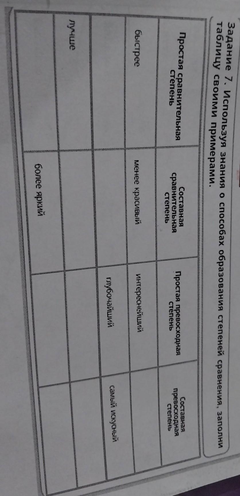 Задание 7. Используя знания о способах образования степеней сравнения, за таблицу своими примерами. Простая сравнительная степень быстрее лучше Составная сравнительная степень менее красивый более яркий Простая превосходная степень интереснейший глубочайший Составная превосходная стеnеHь самый искусный, Срочно даю 50 балов