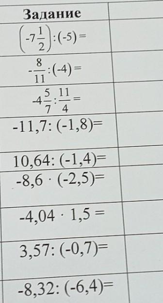 -7- :(-5) = 2 8 —— - :(-4)= 11 45.11. 7 4 -11,7: (-1,8)= = 10,64: (-1,4)= -8,6 (-2,5)= -4,04 1,5 = 3,57: (-0,7)= -8,32: (-6,4)= -2,25: 0,25= Типа так
