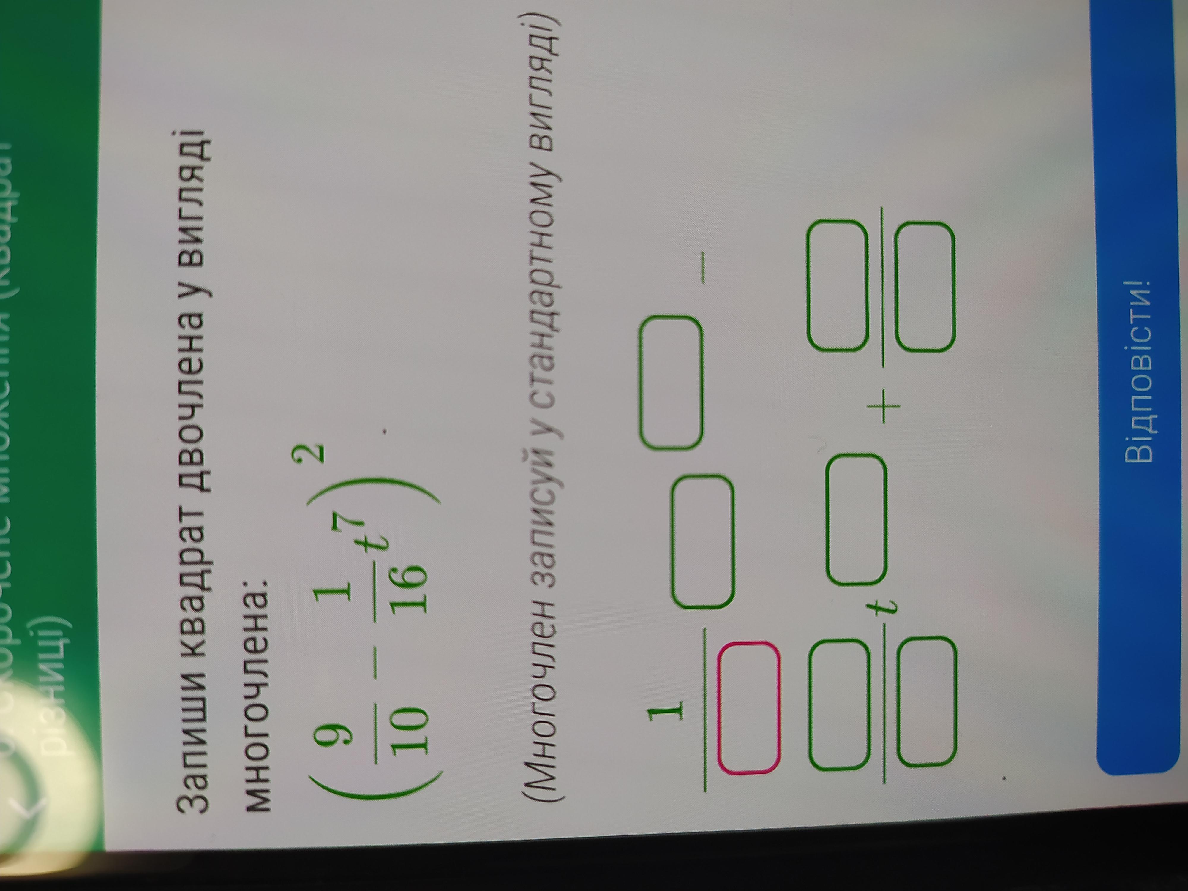 # ( 9/10 - 1/16 t⁷ )² = ( 9/10 )² - 2 * 9/10 * 1/16 t⁷ + ( 1/16 t⁷)² = 81/100 -