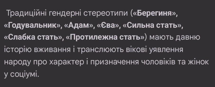 1.Чоловіки часто сприймаються як сильні та лідерські, в то час як жінки часто пов'язуються з обов'язками вдома.