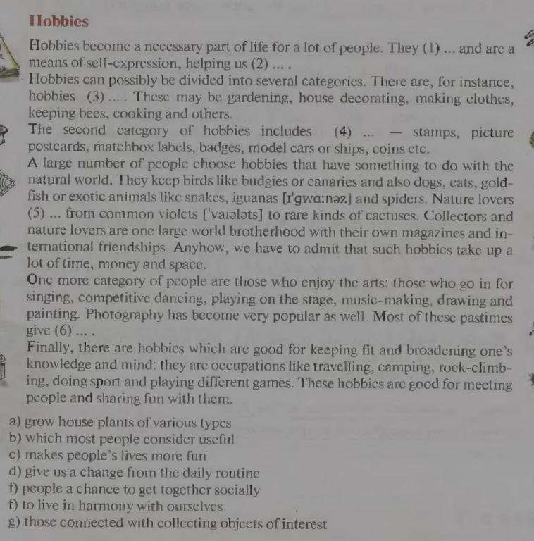 Finally, there are hobbics which are good for keeping fit and broadening one's knowledge and mind: they are occupations like travelling, camping, rock-climbing, doing sport and playing different games. These hobbics are good for meeting people and sharing fun with them.