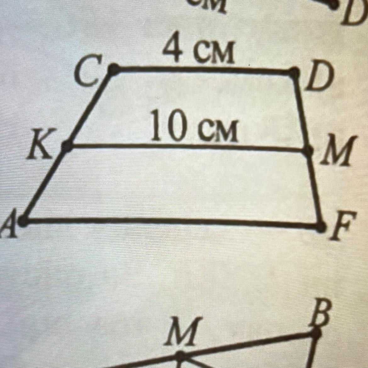 середня лінія трапеції дорівнює пів сумі її основ. Отже AF+CD=2KM, AF=20-4=16см.