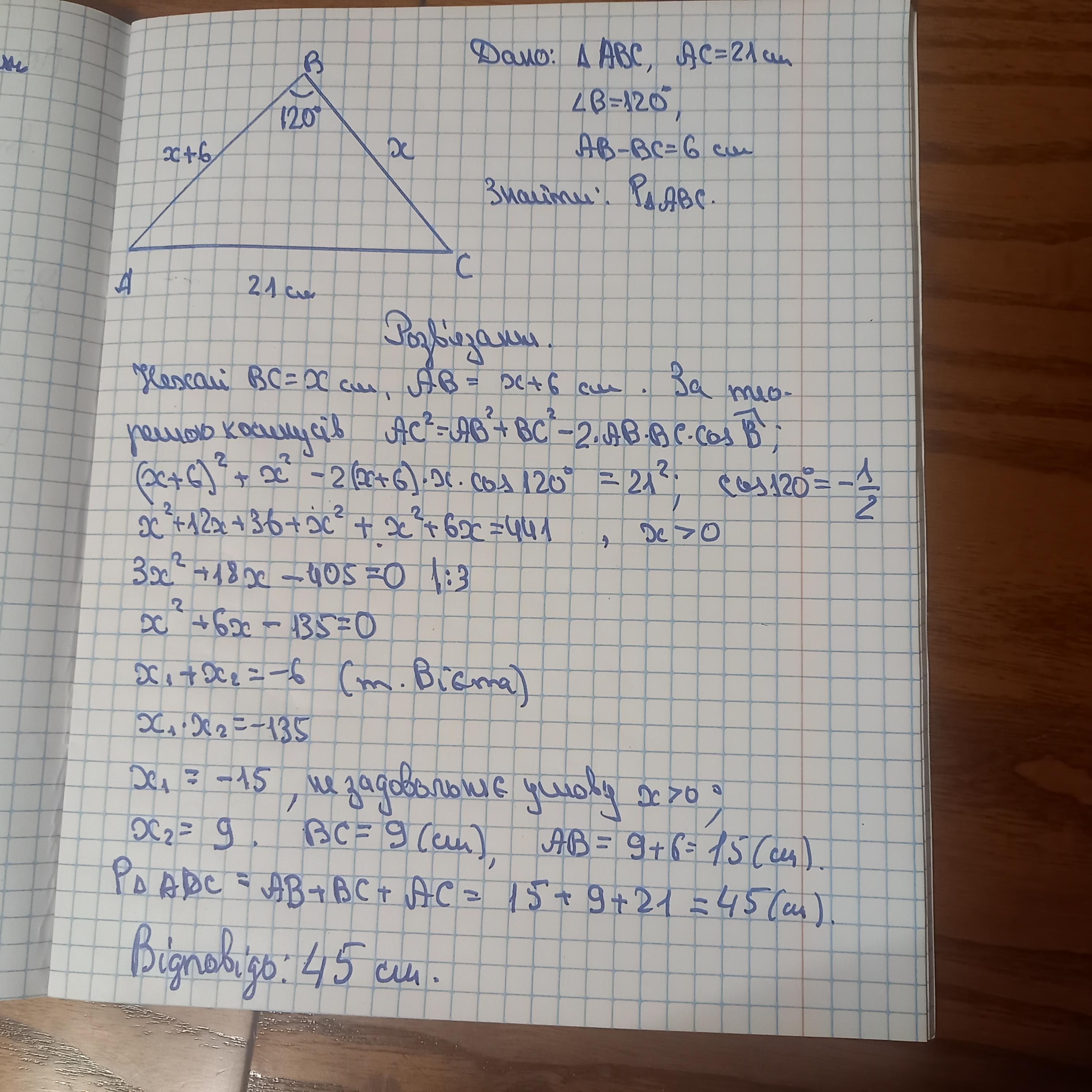 ДАЮ 50 БАЛЛОВ!!! Сторони трикутника, одна з яких на 6 см більша за другу, утворюють кут 120 градусів, а третя сторона дорівнює 21 см. Зобразіть трикутник та знайдіть його периметр.