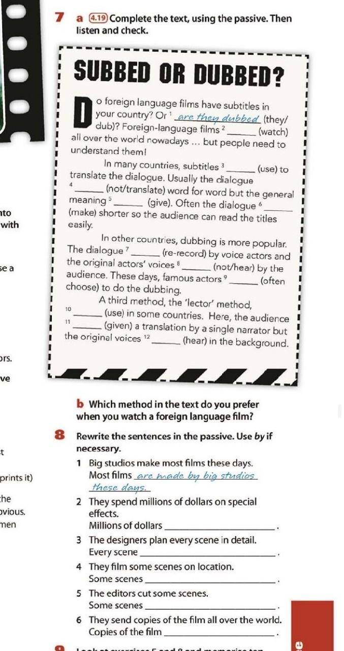 In other countries, dubbing is more popular. The dialogue (7) is re-recorded by voice actors, and the original actors' voices (8) aren’t heard by the audience. These days, famous actors (9) are often chose to do the dubbing.