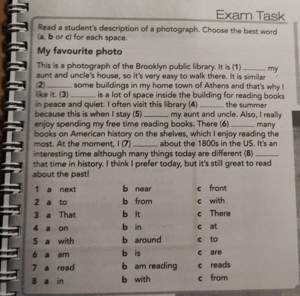 next to That 1 Exam Task Read a student's description of a photograph. Choose the best word (a, b or c) for each space. 2 3 4 5 a a a a a on with 6 a am 7 a read 8 a in b b b It bin b around bis b am reading b with near from front c c with c There cat to с are c reads c from