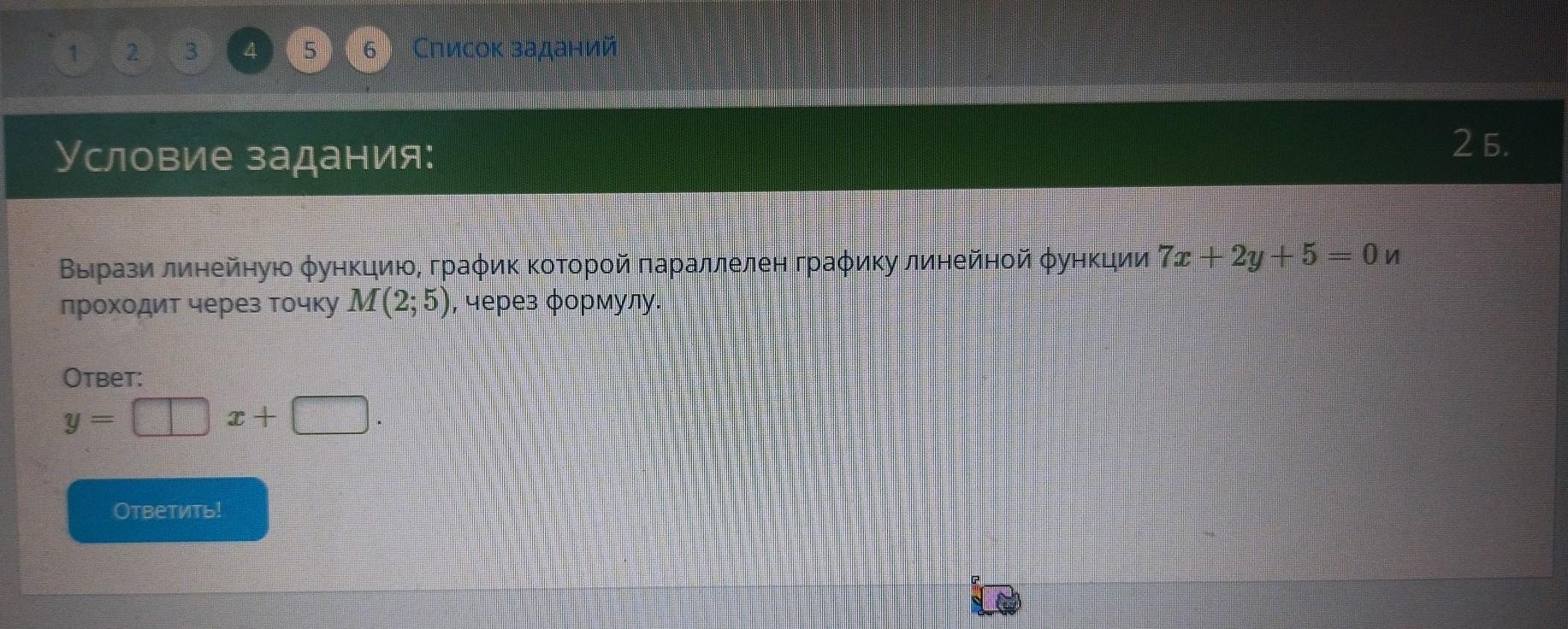 Вырази линейную функцию, график которой параллелен графику линейной функции 7х + 2y +5 = 0 и проходит через точку М(2; 5), через формулу.