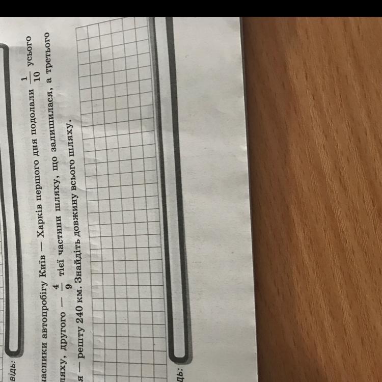 Учасники автопробігу Київ-Харків першого дня подолали 1/10 шляху, а другого - 4/9 тієї частини шляху, що залишилася, а третього дня - решту 240 ки. Знайдіть довжину всього шляху.. СРОЧНОО
