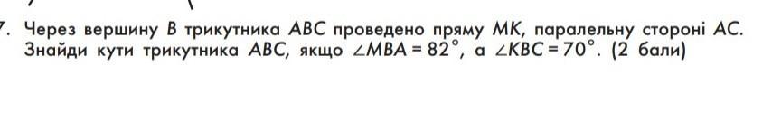 7. Через вершину в трикутника ABC проведено пряму МК, паралельну стороні АC. Знайди кути трикутника ABC, якщо ZMBA = 82°, а Розв'язання як і що знайли