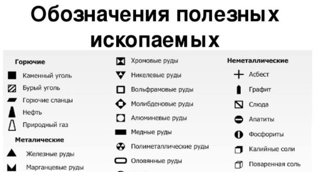 Зображення родовищ корисних копалин на дрібномасштабних картах відносять до знакових груп умовних знаків.