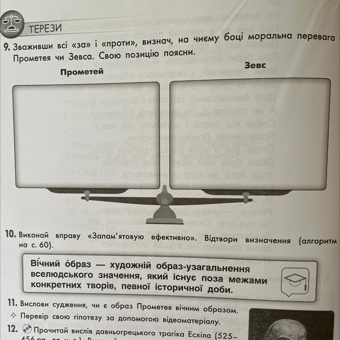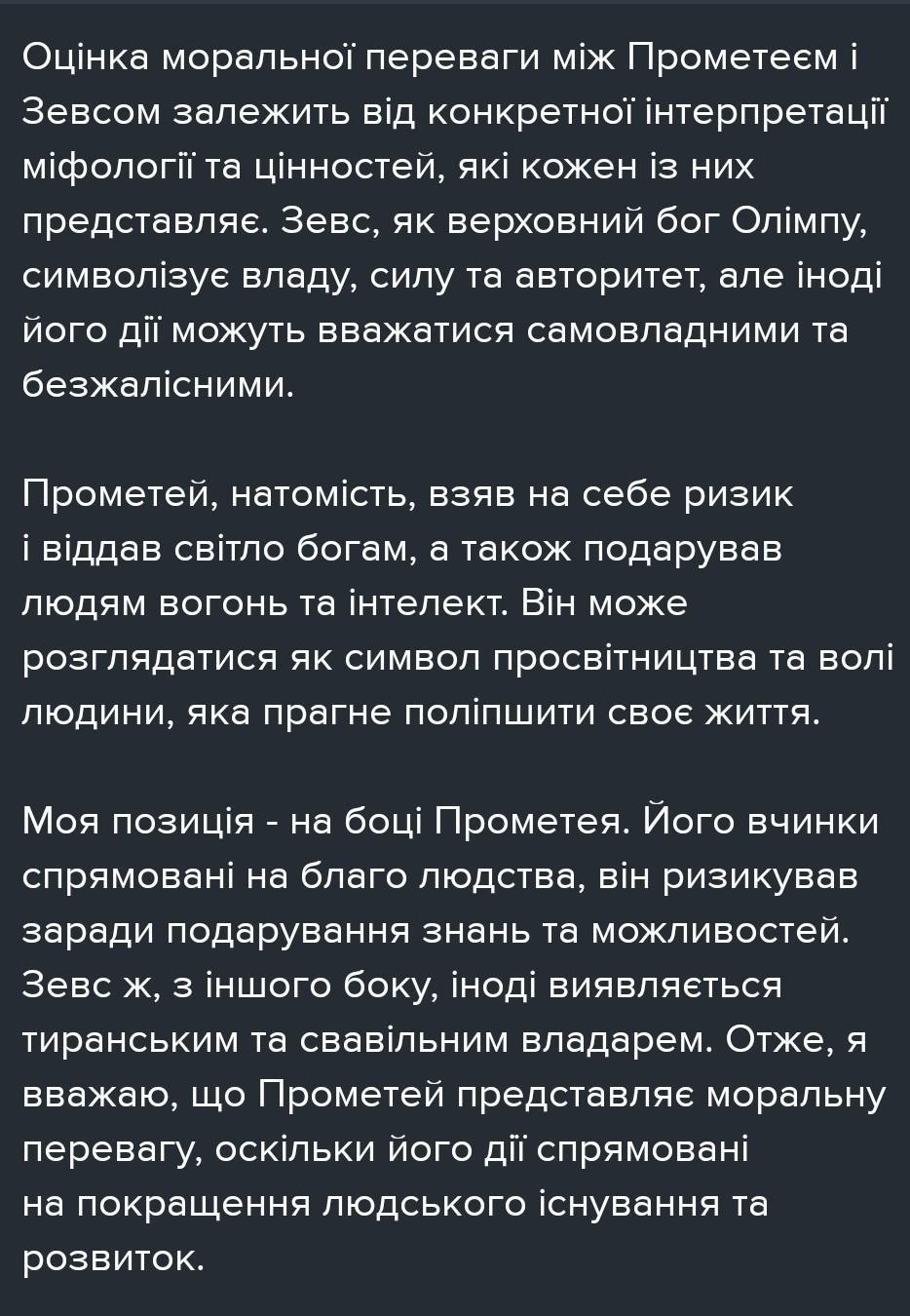 Зваживши всі «за» і «проти», визнач на чиєму боці моральна перевага — Прометея чи Зевса.Свою позицію поясни