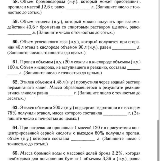 59. Объем этилена (н.у.), который можно получить при взаимодействии 43,6 г бромэтана со спиртовым раствором щелочи, равен \(10.4 \, \text{л}\) (Запишите число с точностью до сотых.)