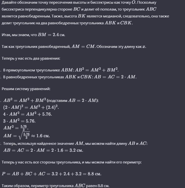 В треугольнике АВС высота ВК делит сторону АС попо- лам, биссектриса АМ перпендикулярна стороне ВС. Най- дите периметр треугольника ABC, если ВМ = 2,4 см. подскажите пожалуйста