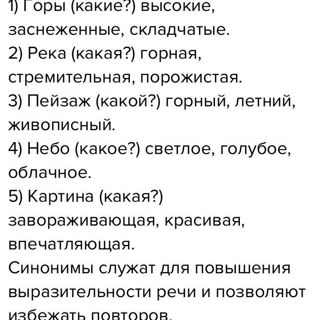 5. Рассмотри репродукцию картины P. Кульбатырова. Опиши еë, подо- брав несколько синонимов к данным словам. 1) Горы (какие?) 2) Река (какая?). 3) Пейзаж (какой?) 4) Небо (какое?) ... 5) Картина (какая?) ... , ... • *******