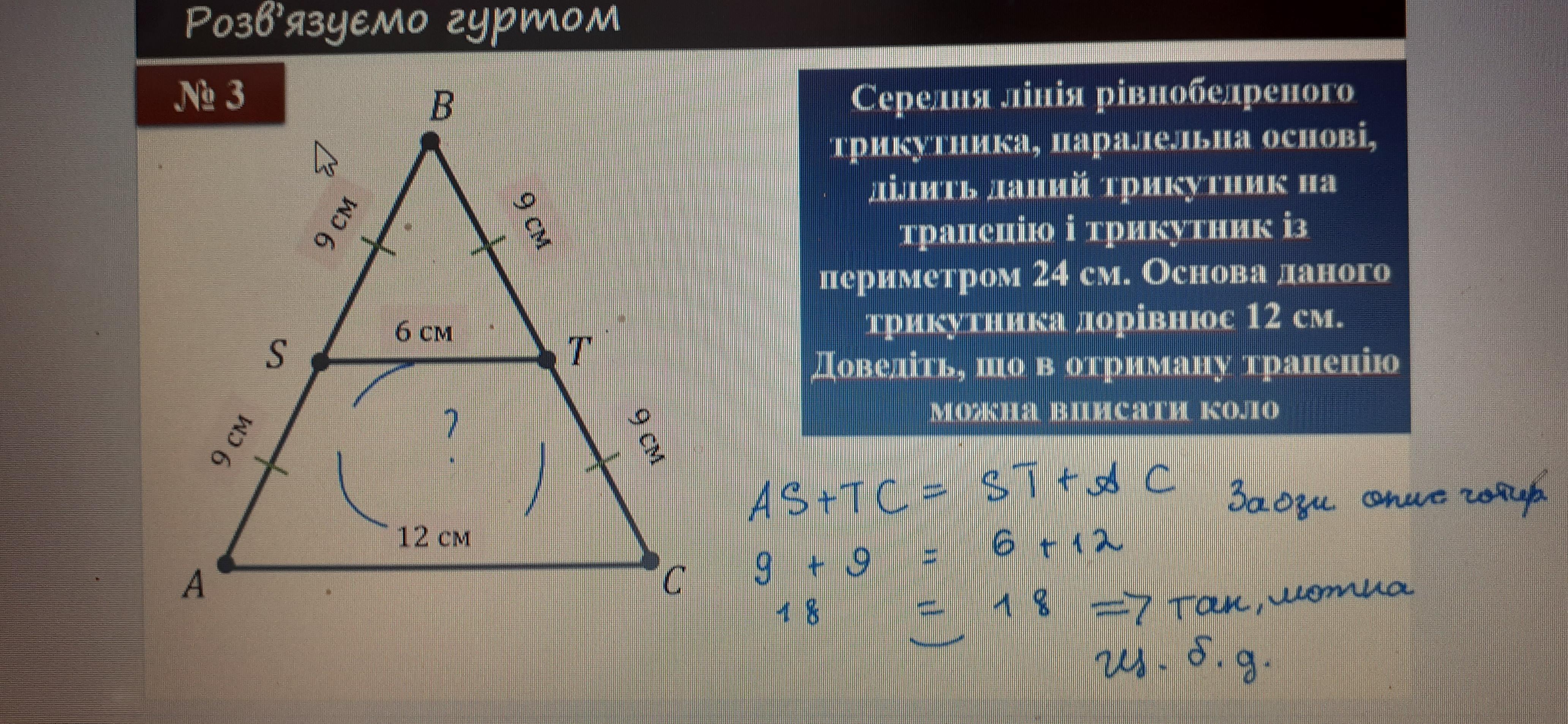 Середня лінія рівнобедреного трикутника, паралельна основі, ділить даний трикутник на трапецію і трикутник із периметром 24 см. Основа даного трикутника дорівнює 12 см. Доведіть, що в отриману трапецію можна вписати коло