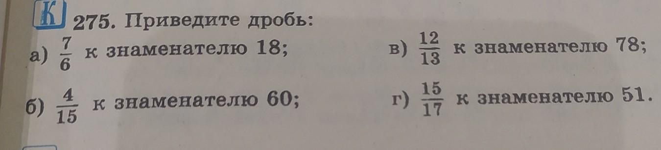 [К] 275. Приведите дробь: (a) 7/ к знаменателю 18; 5) к знаменателю 60; 15 общему знаменателю? B) 132 к знаменателю 78; г) 1 к знаменателю 51.