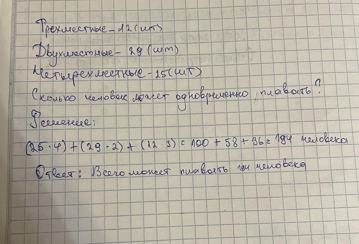 На лодочной станции парка отдыха было 12 трёхместных лодок,29 двухместных лодок и 25 чётыхместных катамаранов.Сколько человек может одновременно плавать на этой флотилии