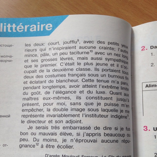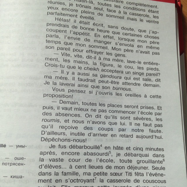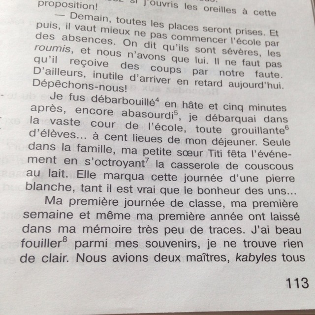 то завтра, взяты все места. И лучше не начинать школьные отсутствия. Они говорят, что они являются серьезными, что roumis, и у нас есть его. Не должны получать он дует наша ошибка. Более того, само прибыть поздно сегодня. Я очистил это было 'в спешке и пять минут спустя, все еще ошеломлен, я приземлился в большом школьном дворе роятся студентов в ста милях от моего обеда. Только в семье, моя сестра Тити Фета событие, которое путем предоставления пан кускус пудинг. Она ознаменовала день с белого камня, а это правда, что счастье одного ... Мой первый день занятий, моя первая неделя и даже мой первый год в моей памяти осталось очень мало следов. Я рылся моих воспоминаний, я не нахожу ничего четкое. У нас было два мастера, Кабильский все 113