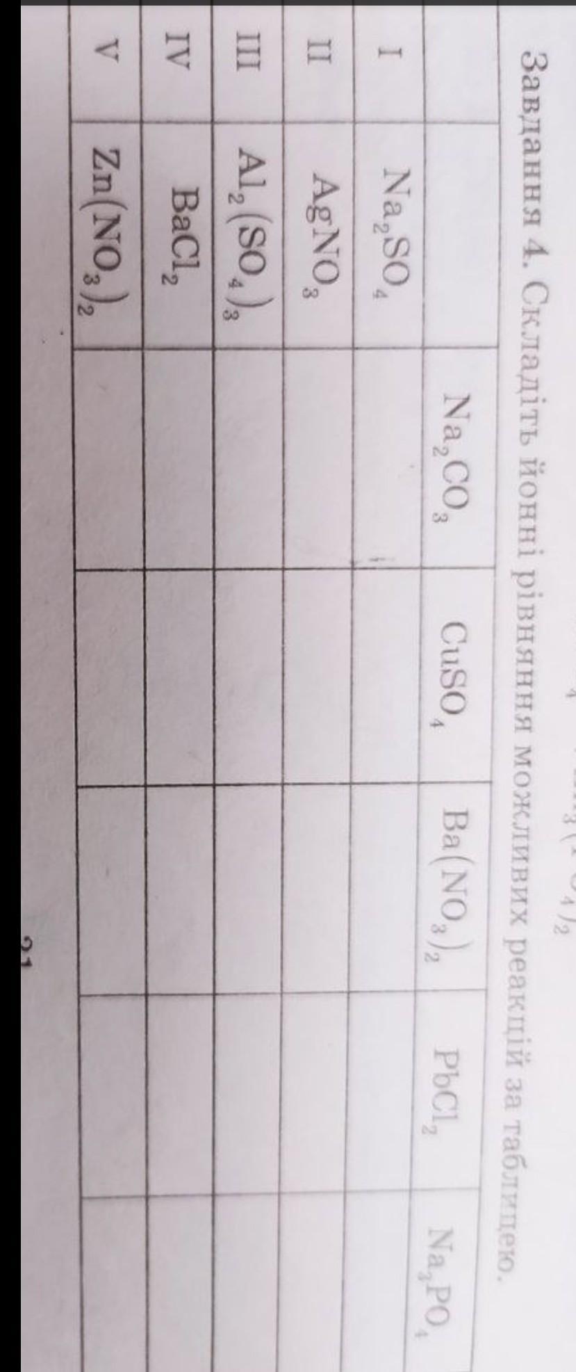 "3 \^ Завдання 4. Складіть йонні рівняння можливих реакцій за таблицею. Na, PO₁ Na₂CO3 CuSO, Ba(NO3), РЬСІ, I II III IV V Na₂SO4 AgNO3 A12 (SO,), BaCl, Zn(NO,),