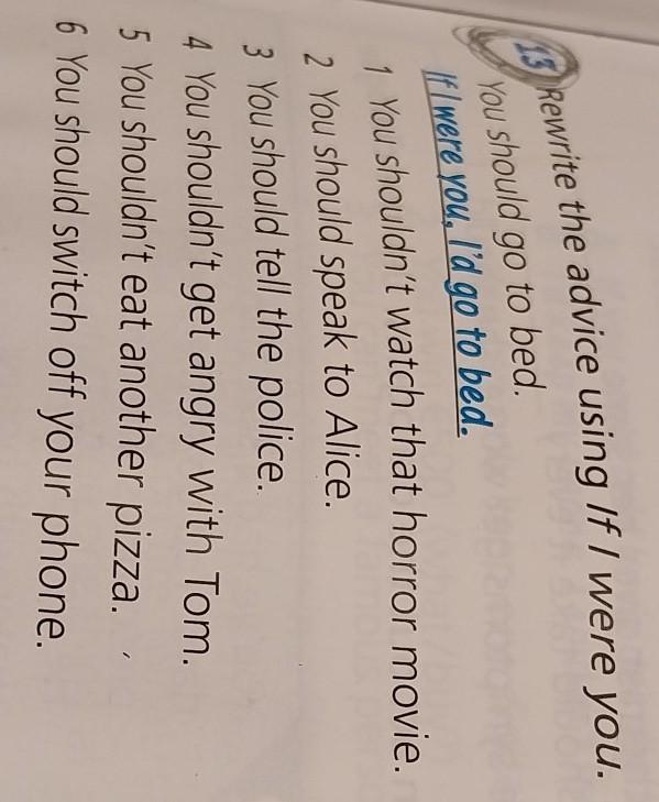 13 Rewrite the advice using If I were you. You should go to bed. If I were you, I'd go to bed. 1 You shouldn't watch that horror movie. 2 You should speak to Alice. 3 You should tell the police. 4 You shouldn't get angry with Tom. 5 You shouldn't eat another pizza. 6 You should switch off your phone.
