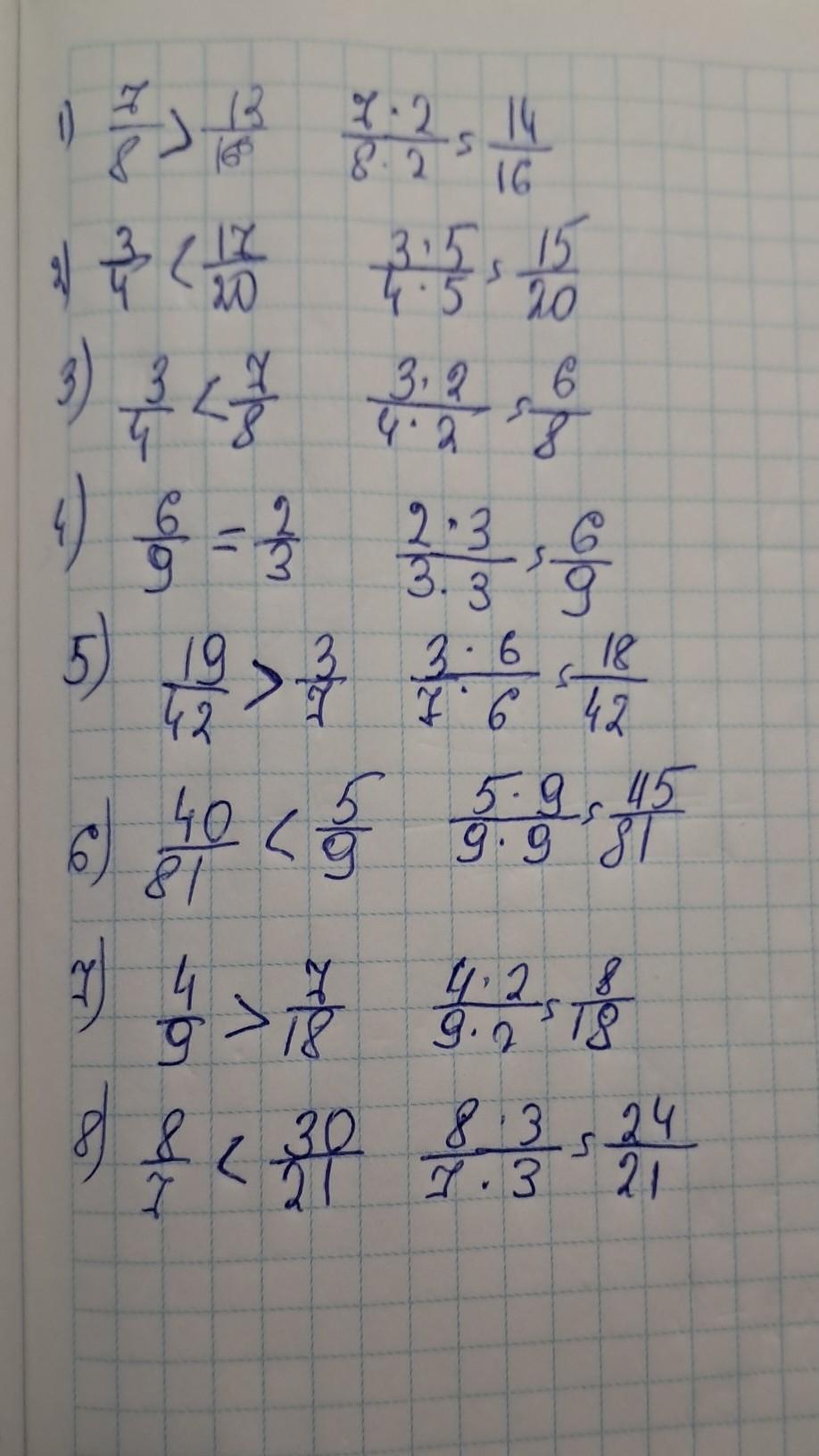 Порівняйте дроби. замініть < або > утворіть дріб так щтоб обидва дроби мали однаковий знаменик