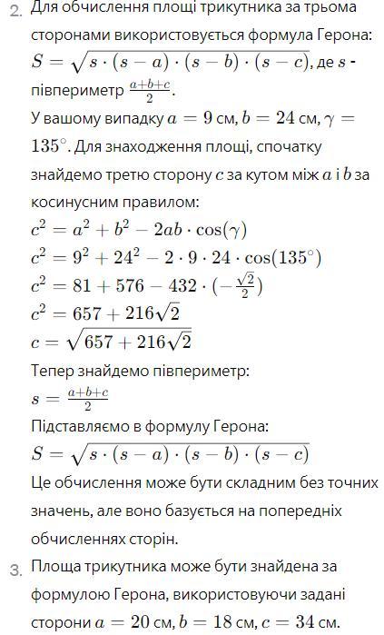2.Знайти площу трикутника в якому а = 9см, b = 24 см, g = 135°