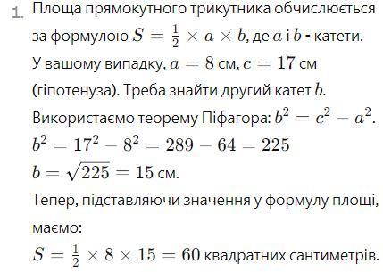 1.Знайти площу прямокутного трикутника, у якого гіпотенуза 17 см, а один з катетів 8 см.