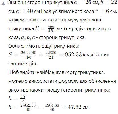 4.Сторони трикутника 26 см, 22 см, 40 см, а радіус вписаного кола 6 см. Знайти площу трикутника і його найбільшу висоту.